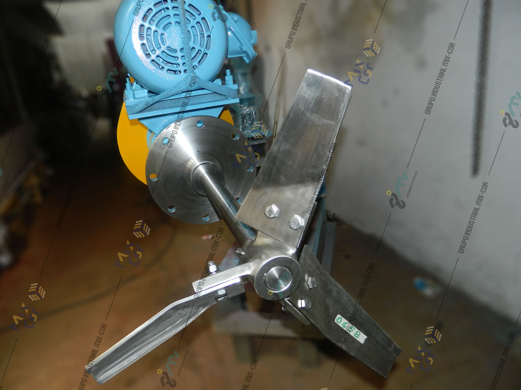 Side entry mixer with mechanical seal and high efficiency impellers in 316 stainless steel for mixing and homogenization of chemical products.