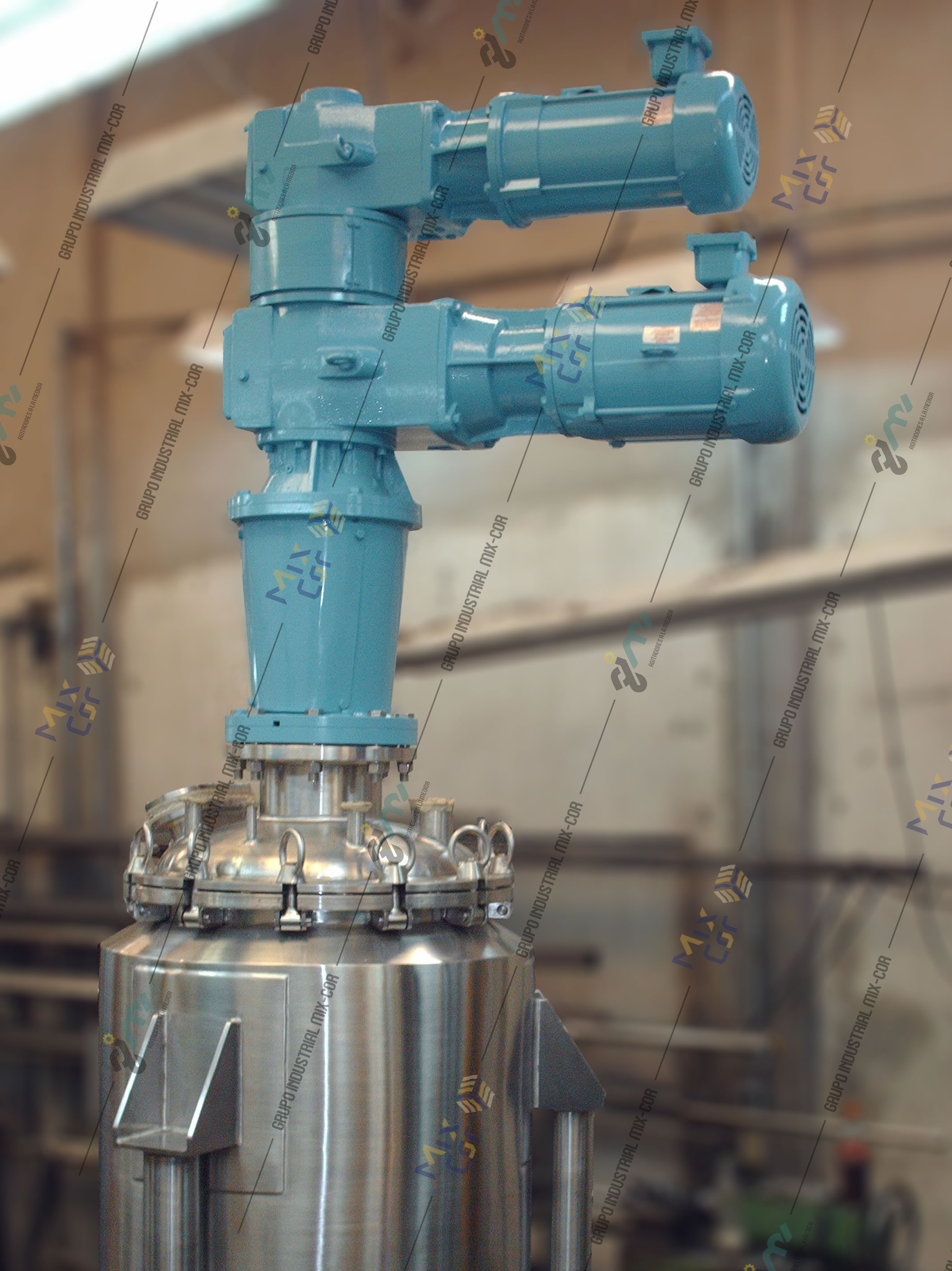 Vertical assembly double effect agitation system for the pharmaceutical / cosmetology industry and in applications in chemical plants with sealing systems with stuffing box or single/double mechanical seals.